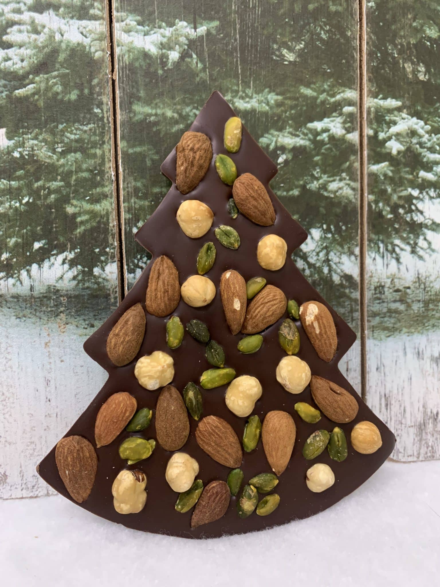 Ingrédients: chocolat noir (pâte de cacao 62%, beurre de cacao, émulsifiant: lécithine de Soja), fruits à coque (pistache, amande, noisette),écorce d’orange, gomme arabique. Peut contenir des traces de lait.